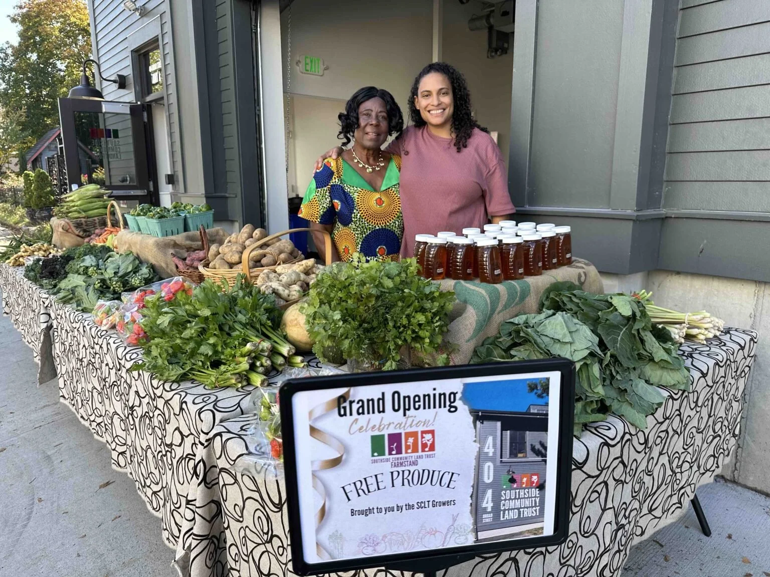Farmer Garmai Mawolo and SCLT’s Kakeena Castro staff the produce giveaway table during the 2023 opening party for SCLT’s Healthy Food Hub in Providence. Photo courtesy of Southside Community Land Trust