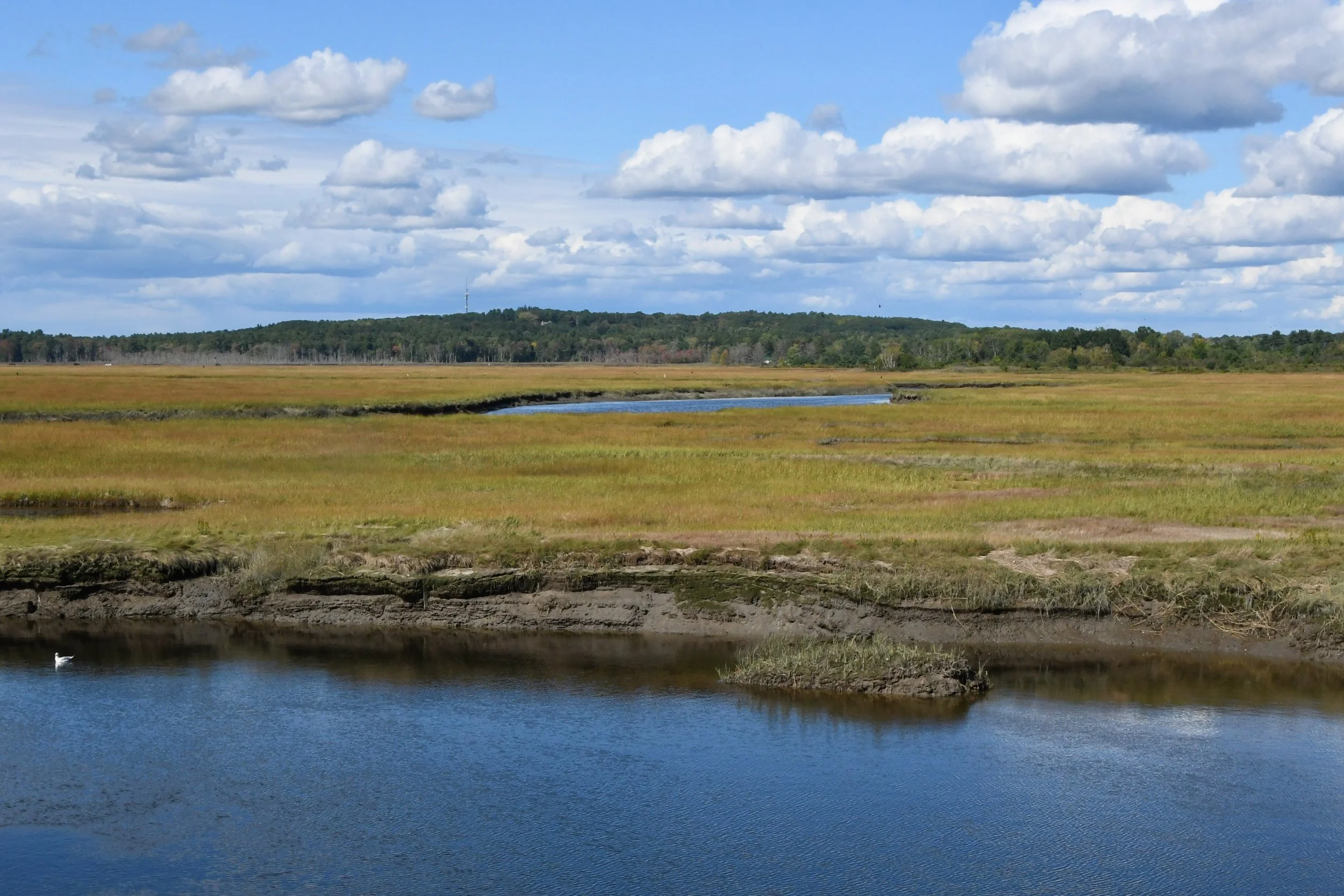 The peat-based marshes of New England are some of the least likely to keep pace with rising seas, because they have comparably low sediment accretion rates, relying primarily on peat buildup from plant detritus to gain elevation—a slower process. Marsh migration may help them persist where such migration is possible. But there are many human barriers. Casco Bay in Maine, for example, has already armored a fifth of its shoreline against sea level rise, therefore armoring it against marsh migration as well. And across the northeastern United States, shifting vegetation patterns, widening channel networks, marsh pool formation, and changing sediment structures are evidence that marshes may be lagging behind rising oceans.