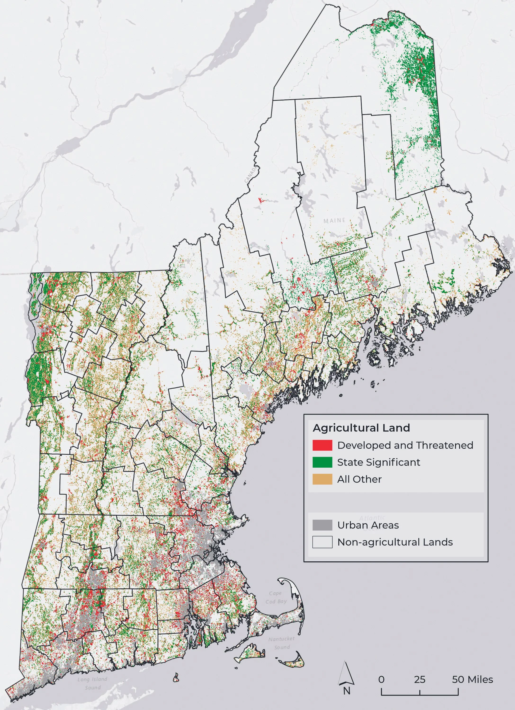American Farmland Trust publishes spatial projections for farmland loss in New England through 2040. The projects include models for “Business as Usual,” “Runaway Sprawl,” and “Better Built Cities.” National and state-level data are available to explore through Farms Under Threat: Choosing an Abundant Future. More recent analysis initially points toward national farmland loss trends that outpace even the “Runaway Sprawl” projections. Farms Under Threat: A New England Perspective