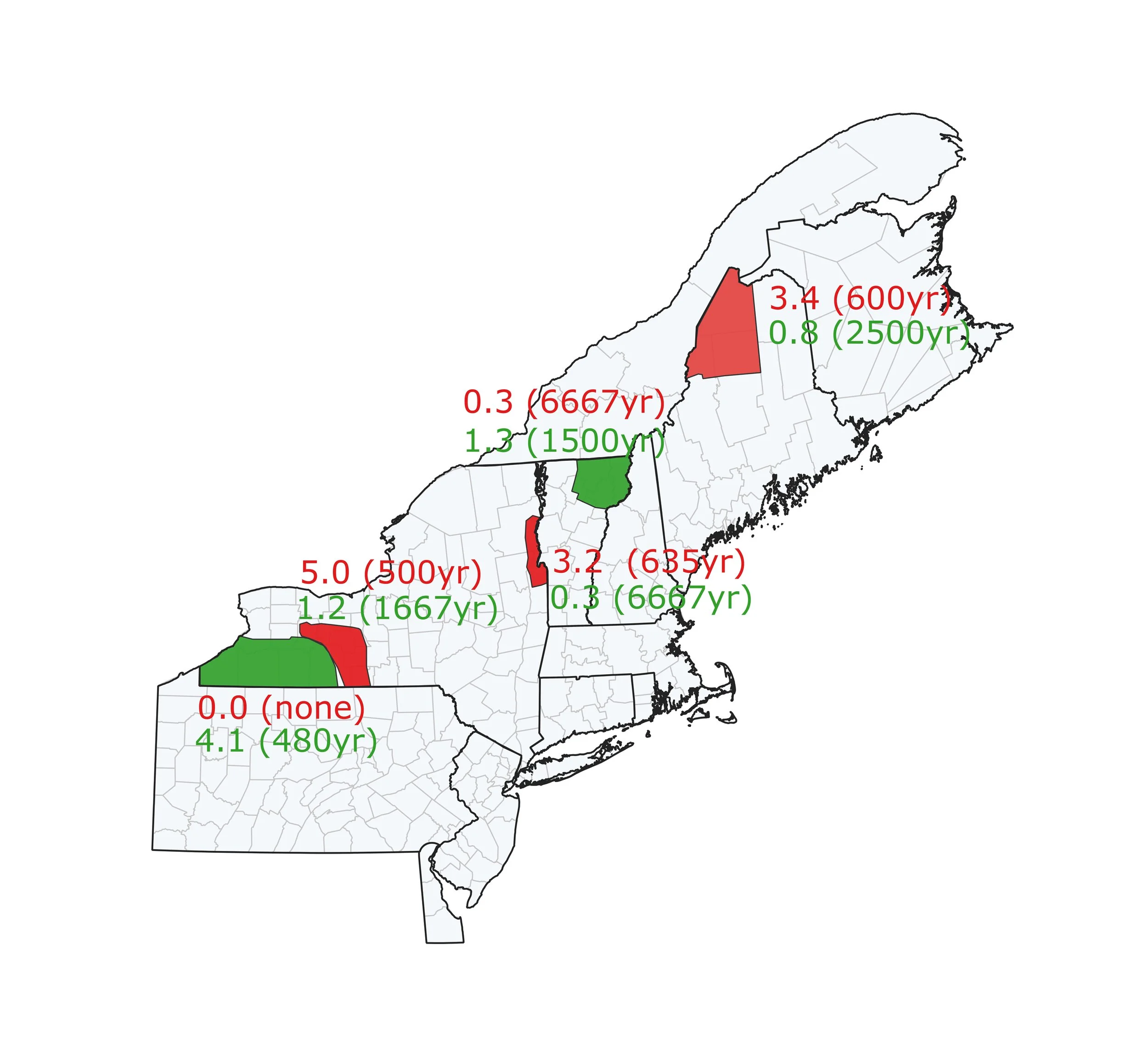 Historic stand-initiating disturbances in selected regions by fire (top numbers) and wind (bottom numbers). The first number is the percent of presettlement survey lines disturbed. Values range from 0.0 (no evidence of disturbance recorded) to 5.0 (5 percent of lines showing the disturbance). The second number, in parentheses, is the calculated return time in years. In red areas, fire is the predominant disturbance; in green areas, it is wind. Figure courtesy of Charlie Cogbill