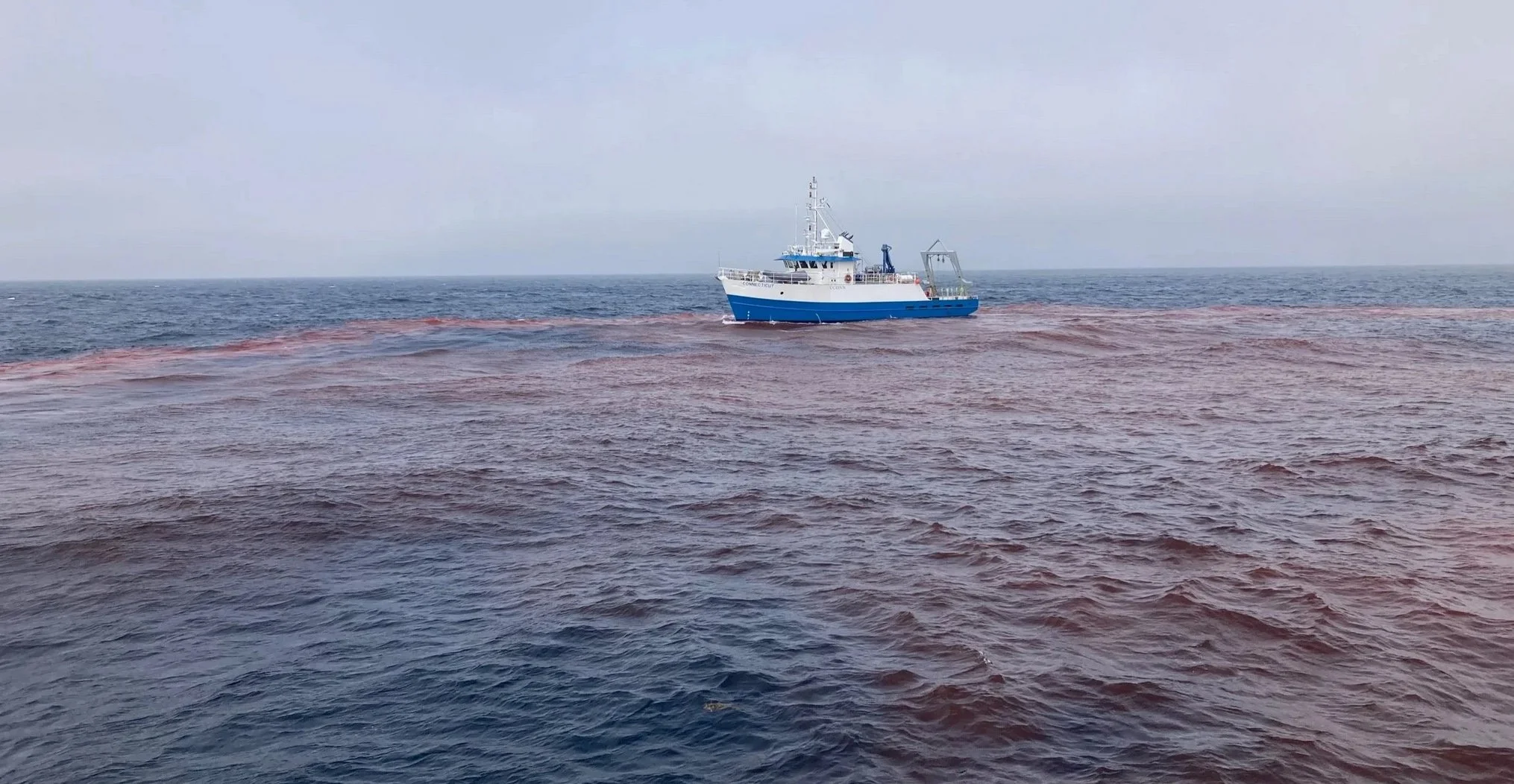 The research vessel Connecticut collects data in the alkaline patch created by the offshore support vessel Mahoney’s dispersal of rhodamine-dyed sodium hydroxide on August 13, 2025. This mCDR pilot project increases the pH of a small patch of ocean water to encourage a short-term bloom of ocean life. Photo courtesy of the Fishery Friendly Climate Action Campaign