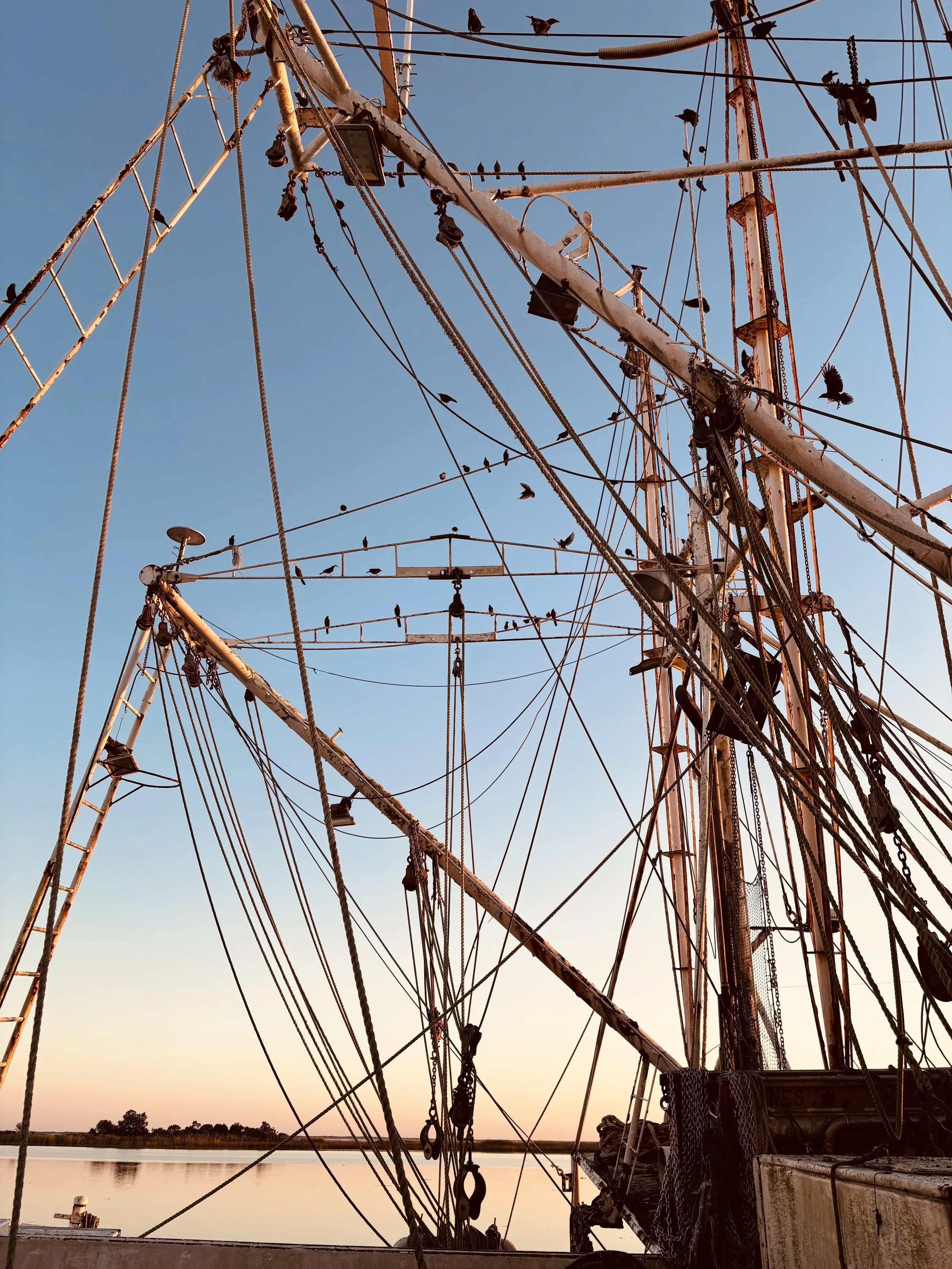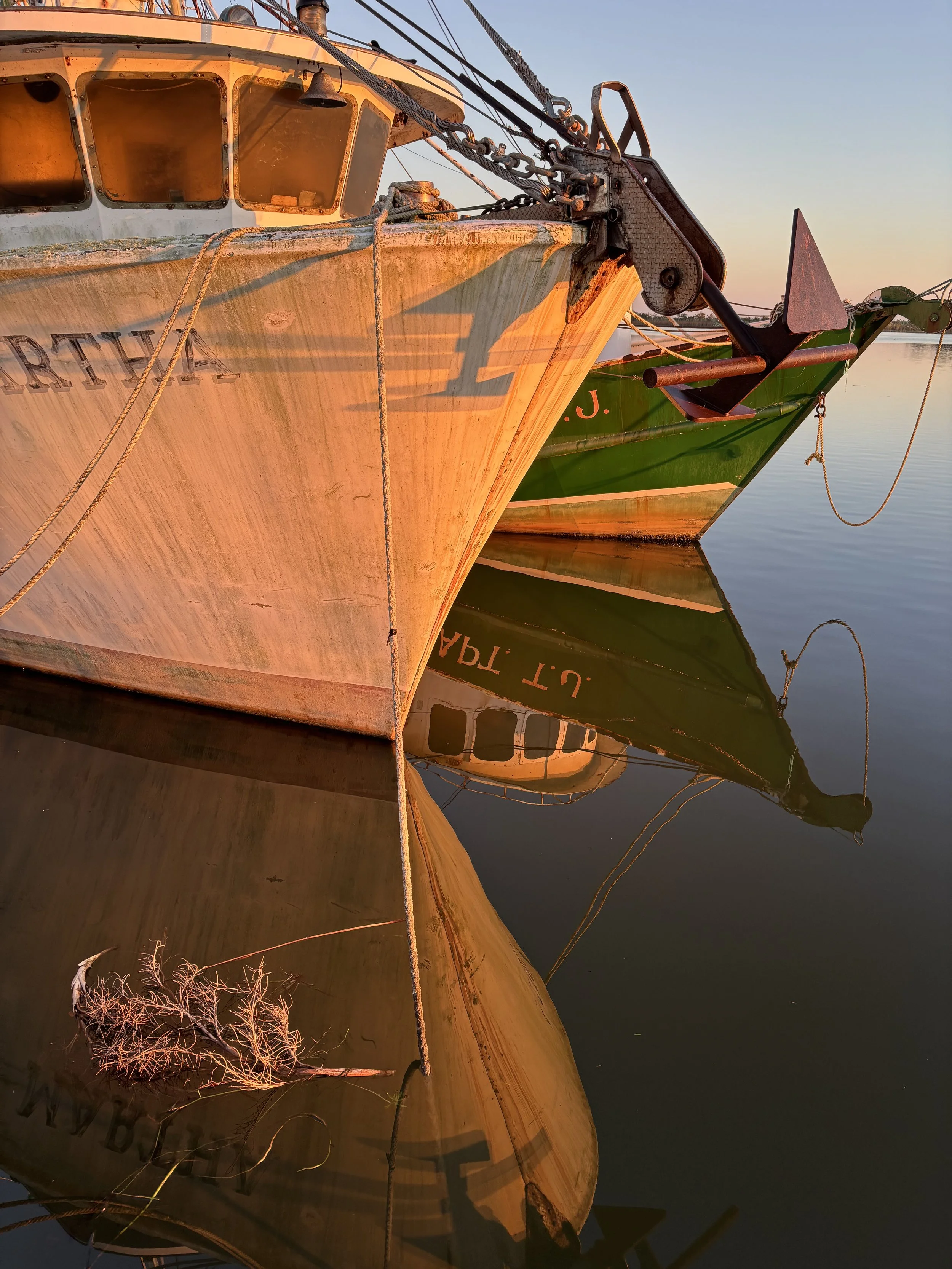 Like toast, the old pier I am standing on is saturated in a marmalade glow from the fading afternoon sun. Except for a person hosing down the stern of their boat at the west end of the harbor, it is quiet until a flock of grackles flies overhead, noisily recapping their day. From the rust-colored patina on the shrimp boats and the way their big wooden hulls sit low in the water, it looks like it has been a while since the harbor was as busy as the birds.