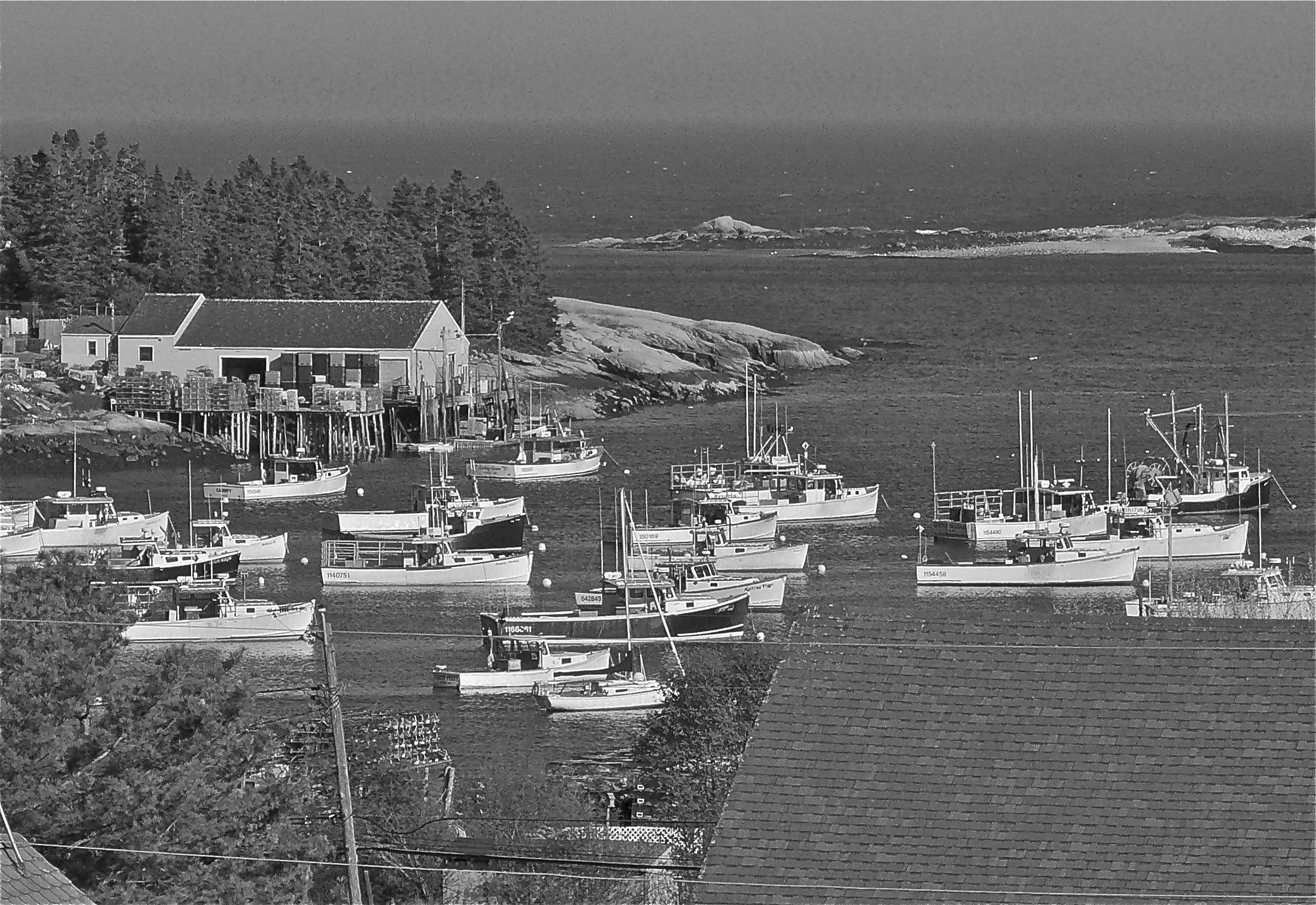 Corea Lobster Co-op and harbor from church steeple. Photo © Paul Breeden