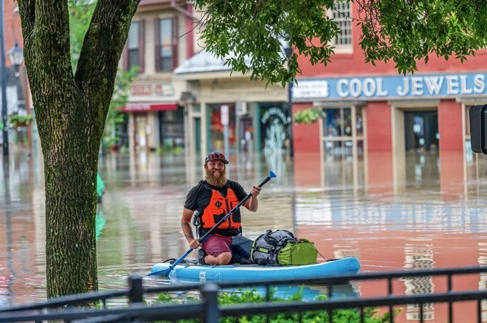On July 11, 2023, a boat was the only way to move through the streets of Montpelier. Courtesy of Montpelier Commission for Recovery and Resilience