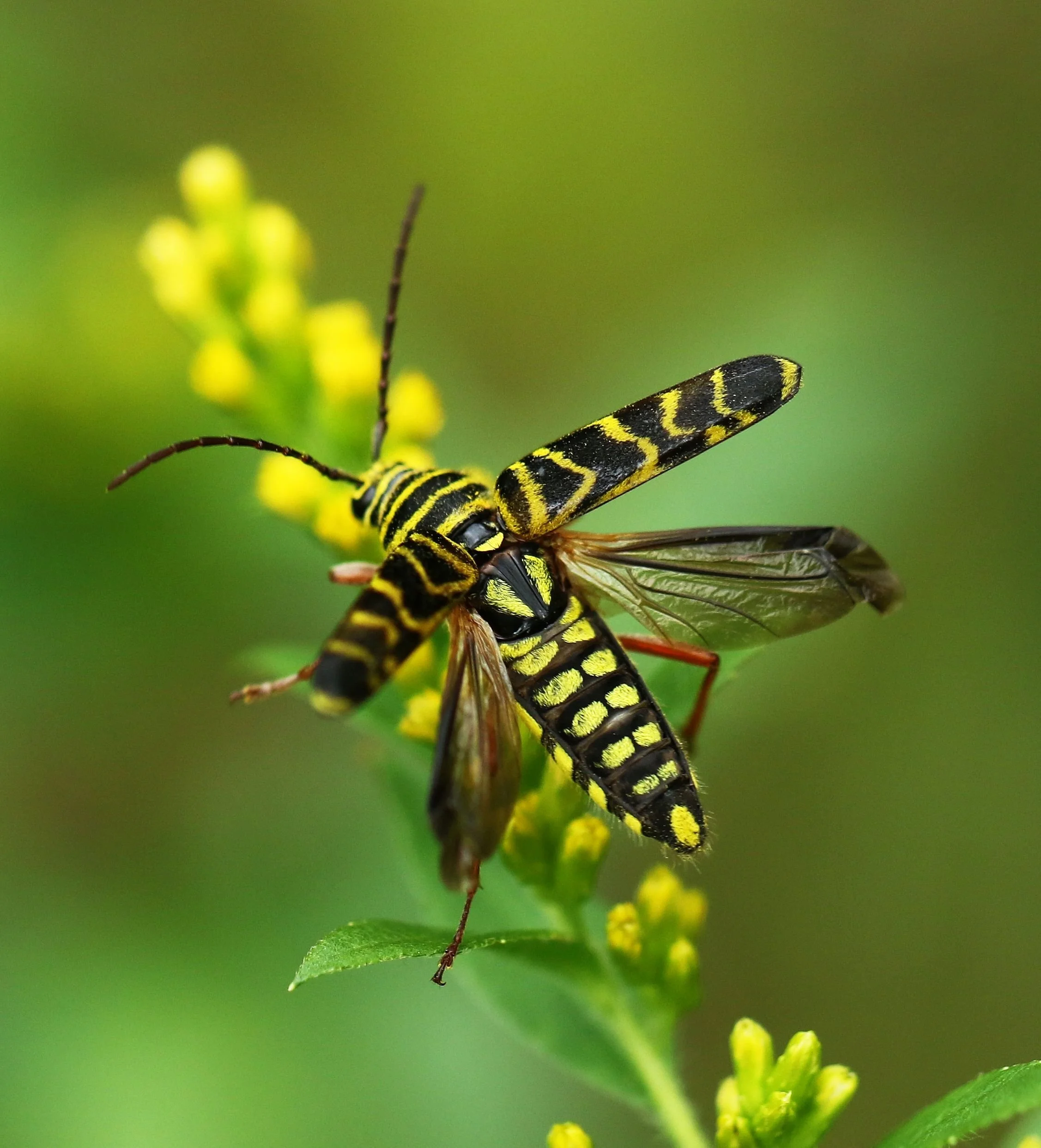 Locust borer is a beetle in a wasp’s colors. It is often seen on flowers of goldenrods, but its larvae feed on the wood of black locust. Photo courtesy of Hawthorne Valley Farmscape Ecology Program